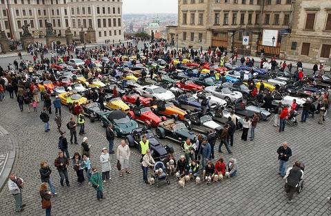 Spanilá jízda Prahou. Na Hradčanském náměstí při závěrečném fotografování parkovalo 106 aut, z toho bylo