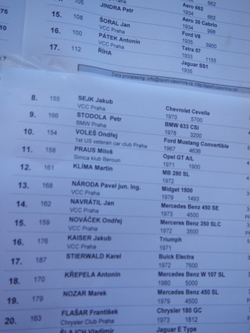 Poprvé jsme se zúčastnili závodu historických vozidel Zbraslav - Jíloviště. Byl to již 47. ročník, který pořádal "Pražský veteran club". V pravidlech je, že každý účastník musí absolvovat 2 jízdy - a to je zajímavé - pokud možno ve stejných časech. Rozdíly se trestně bodují. My, jako nováčci neznalí tratě, jsme nakonec měli rozdíl mezi oběma jízdami pouhé 3 vteřiny a obsadili jsme ve své kategorii docela pěkné 11. místo ze 27. Příště už to bude určitě na bednu :) ......